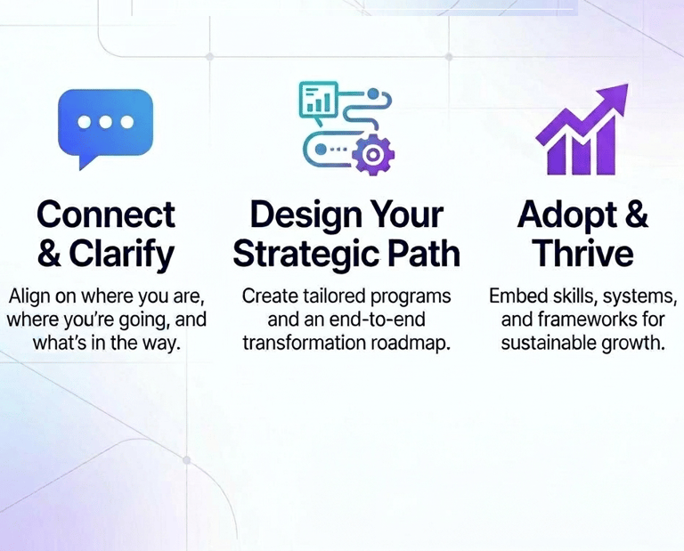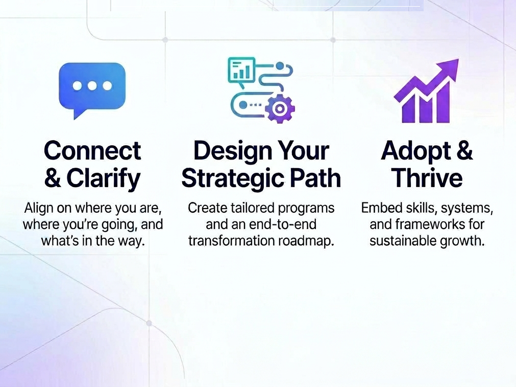 Enabling sustainable growth through leadership alignment, gap-analysis, frameworks adoption, and long-term capability building.
